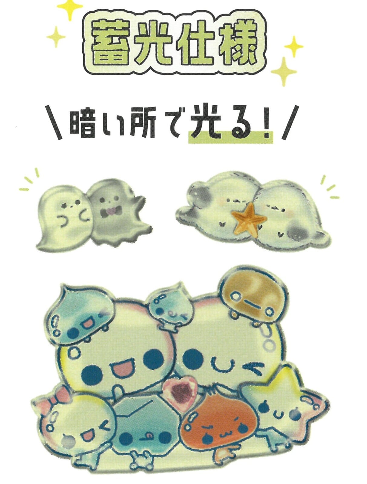 暗いところで光る蓄光仕様のシールストーン付き